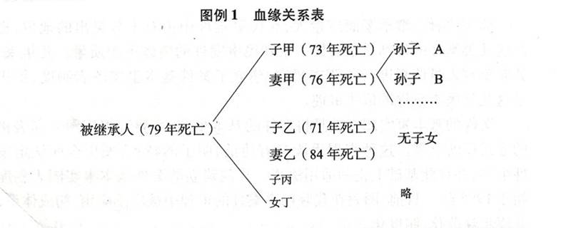 (一)血缘关系表(见图例1)。血缘关系主要反映被继承人的血缘关系延续情况。继承权与特定的人身关系相联系,包括血亲关系(含拟制血亲)、姻亲关系。只有与被继承人有血亲关系或姻亲关系的人才可能成为继承人。所以明确血缘关系和婚姻关系直接关系到继承人继承权的认定。在继承案件中,如果一个被继承人只有一个或几个继承人,血缘关系比较清楚。但如果一个被继承人有数个子女,数子女全部死亡,数子女又各生有数子女,加上子女的妻子、丈夫,子女的子女的妻子、丈夫在内,血缘关系十分复杂。制作图表可以将这种复杂的血缘关系明了化。在血缘关系表中,还应注明被继承人、已死亡继承人的具体死亡时间,以明确划分转继承与代位继承。