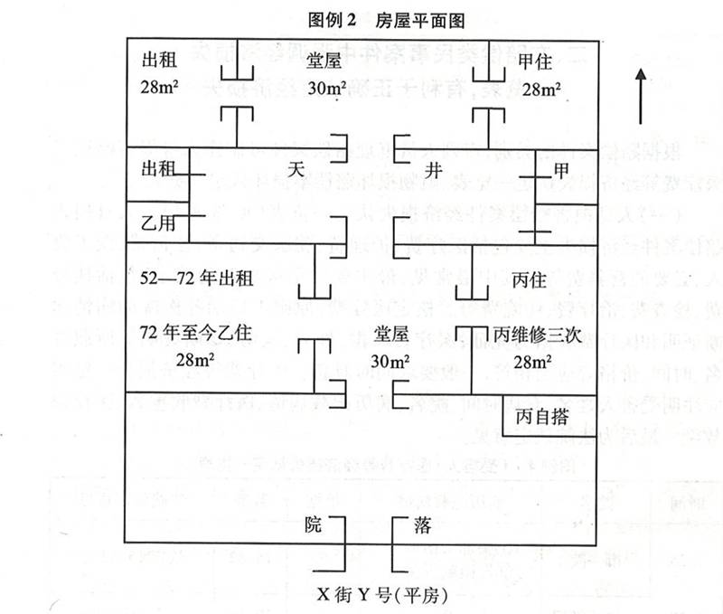 (二)房屋平面图(见图例2)。房屋是继承案件中最有争议的问题之一。根据《继承法》第29条的规定,遗产分割应当有利于生产和生活的需要,不损害遗产的效用。制作房屋平面图,必须注明房屋的坐落地址,面积,结构,房屋使用状况,房屋变迁情况,继承人对房屋尽保管、维修等义务情况。力求从一张图表中基本反映出房屋如何分割才合法合理。