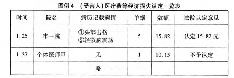 (一)人身损害赔偿案件经济损失认定一览表(见图例4)。人身损害赔偿案件经济损失主要包括医疗费、护理费、就医交通费、住宿费、误工收入、必要的营养费等。其中最常见、最主要的是医疗费的认定,包括挂号费、检查费、治疗费、住院费等。核定医疗费,原则上以治疗医院的病情诊断证明和医疗费收据为凭证,医疗费收据、处方、病历、诊断证明等所载姓名、时间、价格等应当相符,一般要求同时具备。医疗费等经济损失一览表应注明受害人姓名、看病时间、院名、病历记载病情、医疗费收据数、医疗费数额。最后为法院认定意见。