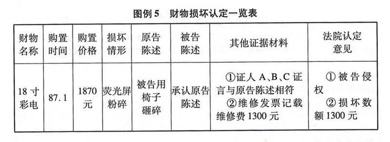 (二)财产损坏赔偿案损失认定一览表(见图例5)。在财物损坏赔偿案中赔偿数额的认定相对人身损害赔偿案件中医疗费的认定更为复杂。财物本身折旧程度,财产自身结构、性能都可能对财物被损坏后的价值产生影响。制作财物损坏赔偿案件经济损失认定一览表,应着重反映财物损坏性质、财物损坏状况两项基本事实,主要设项应包括损坏财物名称、购置时间、折旧程度、损坏状况、原告陈述、被告陈述、其他证据材料、法院认定意见。