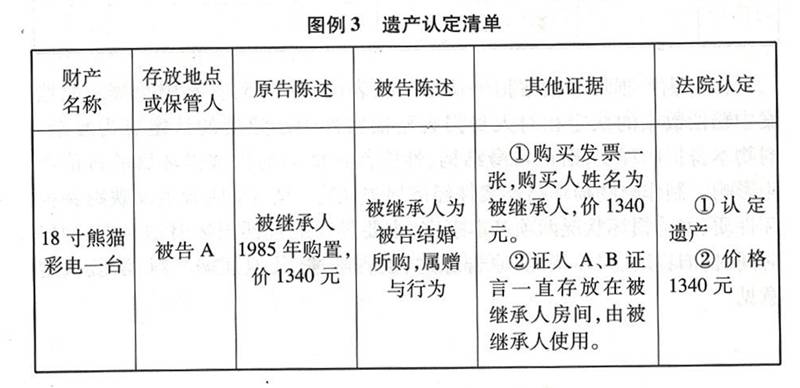 (三)遗产认定清单(见图例3)。准确地认定遗产范围,是继承纠纷中又一重要而复杂的问题。遗产认定清单主要应注明遗产名称、存放地点或保管人姓名,原告陈述意见,被告陈述意见,其他证据材料,法院认定意见。原告、被告、法院意见及其他证据中应当包括财产性质和价格两项内容。制作遗产认定清单可参见图例3,遗产认定清单主要运用在当事人对遗产性质有分歧的情况下。如果当事人双方对遗产性质认识一致,只是对如何分割有分歧,审判人员只要制作遗产清单即可,注明遗产名称、存放地点或保管人姓名、原告承认价、被告承认价、有关部门估价、法院认定价等几个项目。制作遗产认定清单或遗产清单,有利于贯彻遗产分割应当穷尽全部遗产的原则。