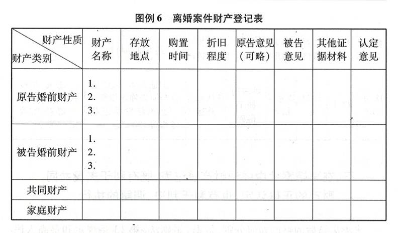 夫妻离婚后的财产如何分割,根据《婚姻法》第13条规定和最高人民法院《关于贯彻执行民事政策法律若干问题的意见》第12条、第13条、第15条意见,关键在于正确划分夫妻共同财产与家庭共同财产、个人财产之间的界限。正确认定财产的性质一般可以从财产来源、购置时间、使用情况来认定。具体分割财产还要考虑到财产本身的价值、效用。制作离婚案件财产登记表,主要设项有:财产名称、数量、购置时间、折旧程度、存放地点或保管人、原告陈述、被告陈述、其他证据材料、法院认定意见。制作方法可见图例6。离婚案件财产登记表,在起诉阶段由原告填写,一式两份,一份交法院,一份交被告。由被告根据原告填写内容进行书面答辩或当面对质,最后由法院进行审查、核实。